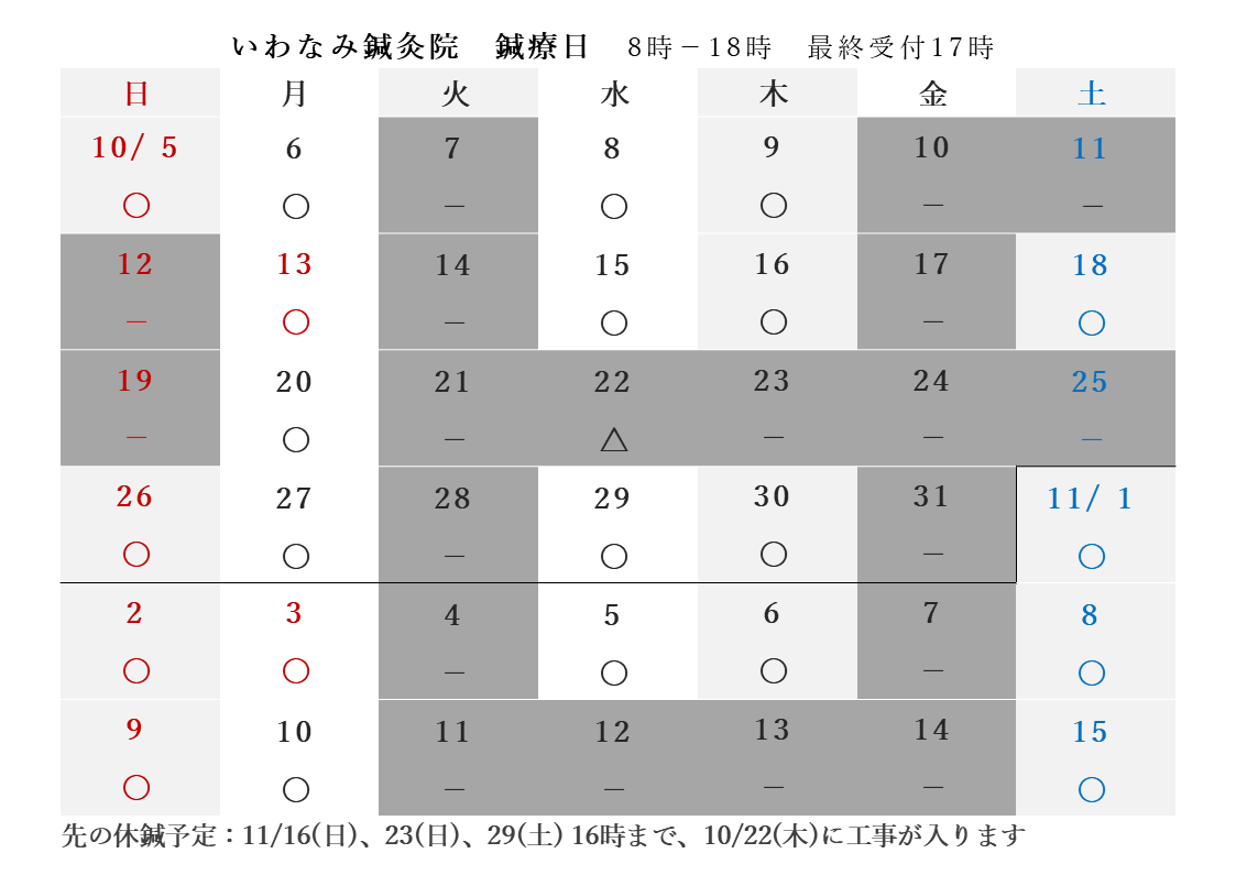 鍼療日・ニュース 2025.10.09 鍼療日 鍼療日のおしらせ 10/5-11/15 ・10/11(土)、12(日)、19(日)、11/23(木)-25(土)を講演・研究発表のため休鍼 ご予約、お待ち申し上げます※空き時間の確認は、お問い合わせからご連絡ください