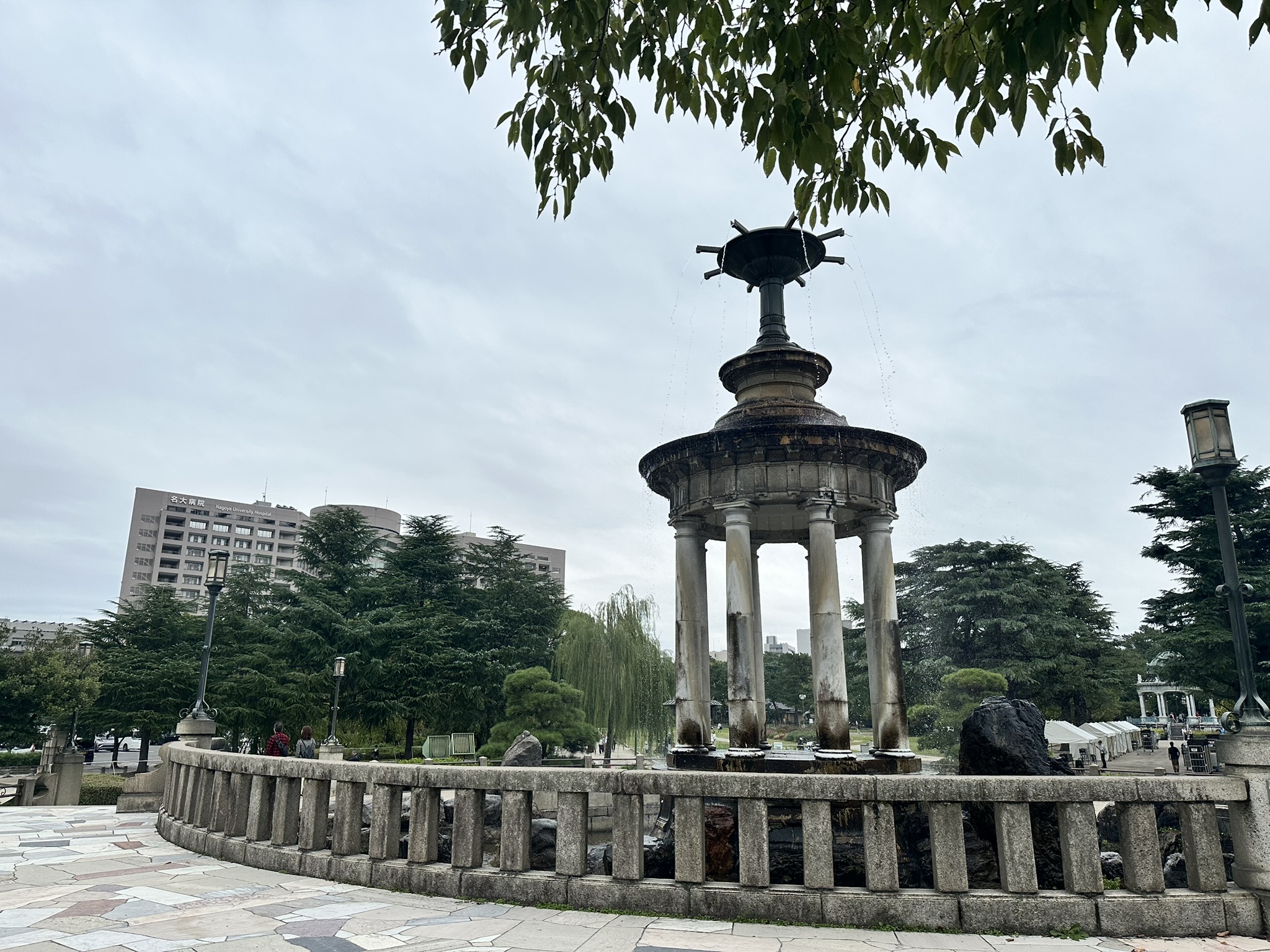翌日、昼食に抜け出して、知人に会うため鶴舞駅に。ちょっと待つことになり、改札出てすぐ目の前の鶴舞公園へ。明治時代に立ったという噴水が名物とのこと。横のベンチに座って眺めていたら、その奥に名古屋大学付属病院が。シンポジウムでは同病院の総合診療科の佐藤寿一先生とご一緒させていただきました。思わぬご縁の良い眺めでした。