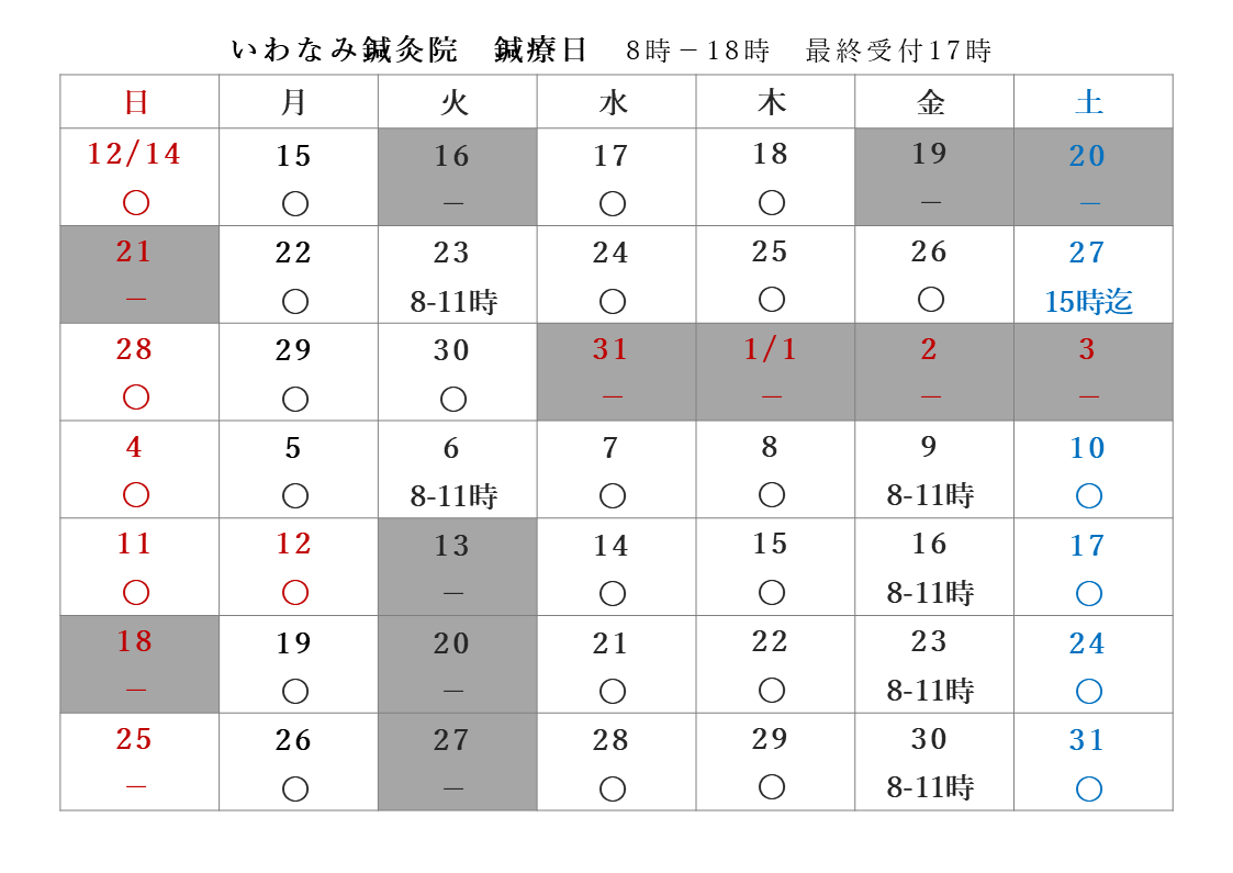 鍼療日・ニュース 2025.12.13 鍼療日 鍼療日のおしらせ 12/14-1/31 休鍼日・12/20(土)、21(日)・年末年始は、12/31(水)-1/3(土)を休鍼する予定です。 ご予約、お待ち申し上げます。※8-11時鍼療をご希望の場合、および空き時間の確認はお問い合わせからご連絡ください。
