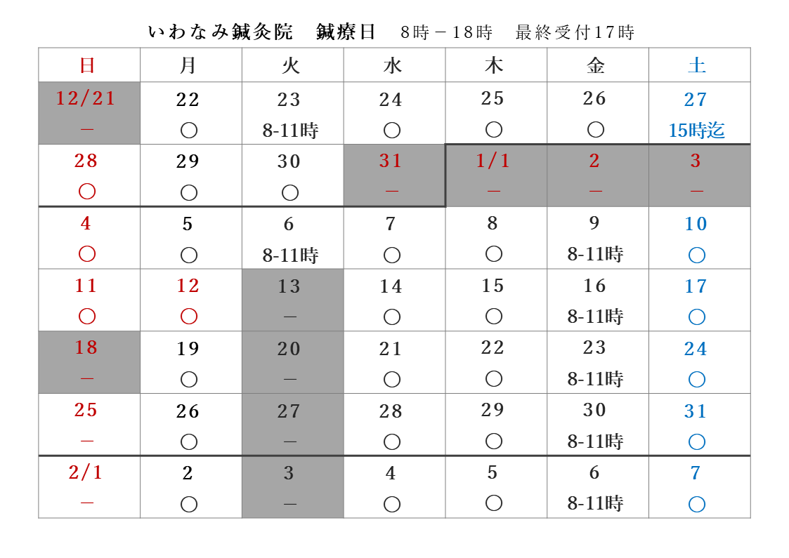 鍼療日・ニュース 2025.12.18 鍼療日 鍼療日のおしらせ 12/21-2/7 休鍼日・12/20(土)、21(日)・年末年始は、12/31(水)-1/3(土)を休鍼する予定です。 ご予約、お待ち申し上げます。※8-11時鍼療をご希望の場合、および空き時間の確認はお問い合わせからご連絡ください。