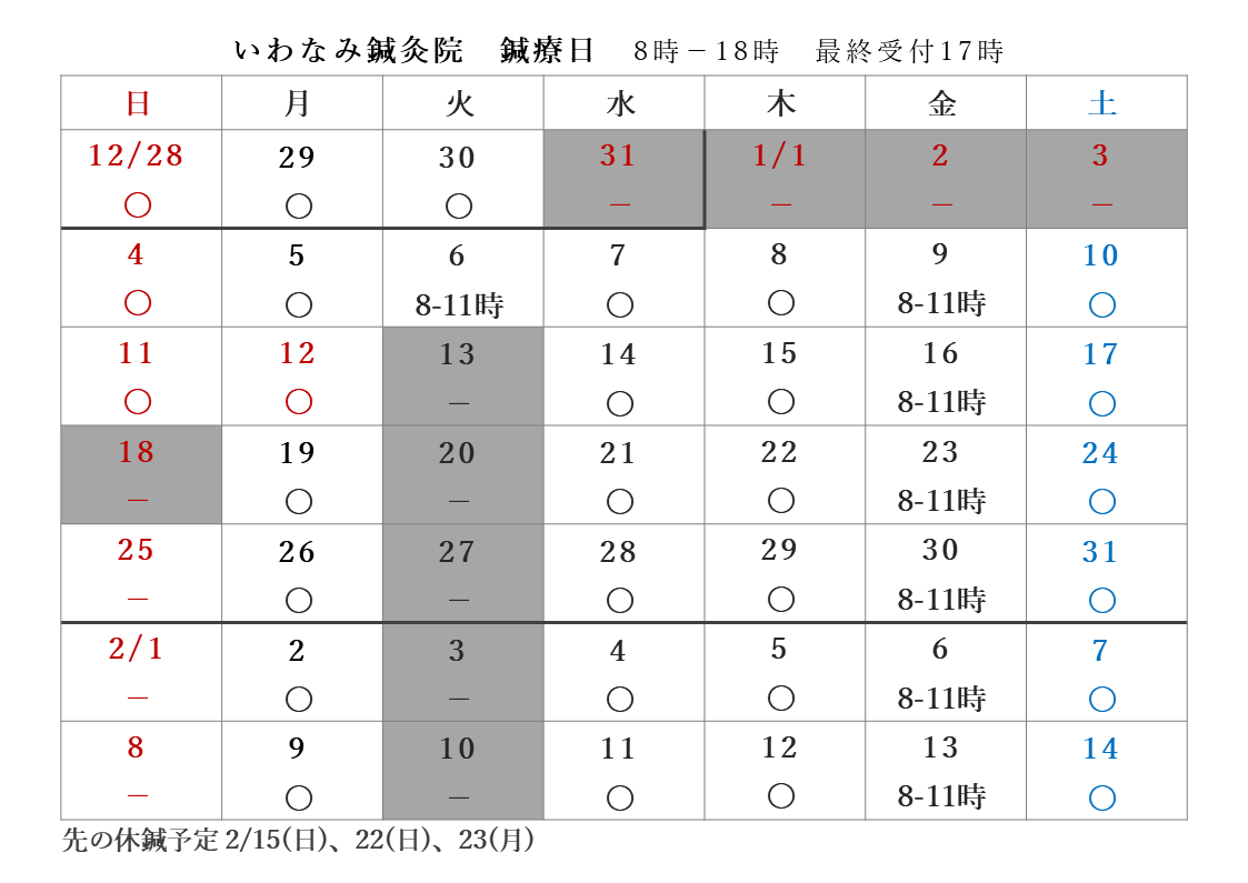 鍼療日・ニュース 2025.12.27 鍼療日 鍼療日のおしらせ 12/28-2/14 ・12/31(水)-1/3(土)、1/18(日)を休鍼します。 ご予約、お待ち申し上げます。※8-11時鍼療をご希望の場合、空き時間の確認はお問い合わせからご連絡ください。