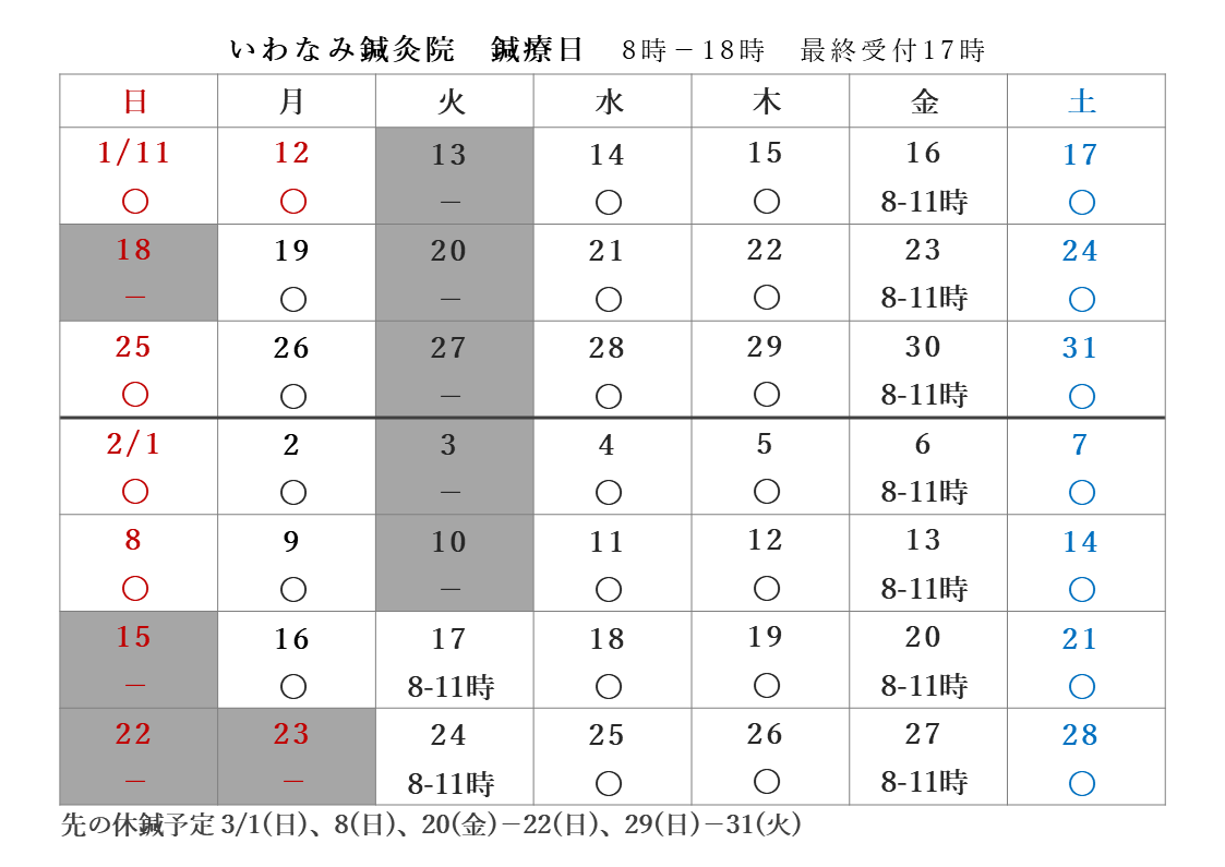 鍼療日・ニュース 2026.01.10 鍼療日 鍼療日のおしらせ 1/11-2/28 ・1/18(日)、2/15(日)、22(日)、23(月祝)を休鍼します。・先の休鍼予定:3/1(日)、8(日)、20(金)-22(日)、29(日)-31(火)・3月中の火金は鍼療日になります。 ご予約、お待ち申し上げます。※8-11時鍼療をご希望の場合、空き時間の確認はお問い合わせからご連絡ください。