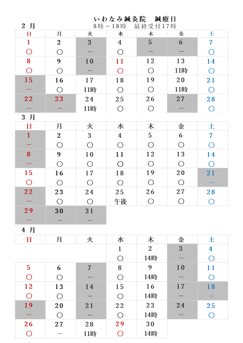 鍼療日・ニュース 2026.02.13 鍼療日 鍼療日のおしらせ 2月・3月・4月 ・2/15(日)、22(日)、23(月祝)を休鍼します。 ご予約、お待ち申し上げます。※8-11時鍼療をご希望の場合、空き時間の確認はお問い合わせからご連絡ください。
