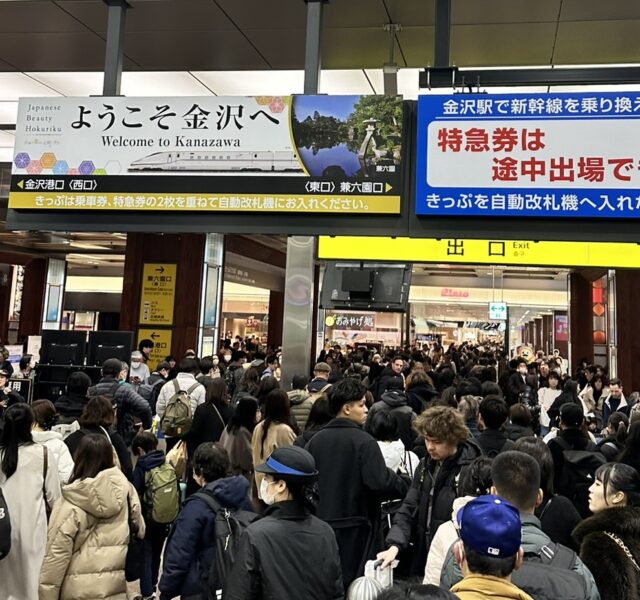 新幹線は満席。連休の金沢駅はご覧のとおりの大混雑でした…。