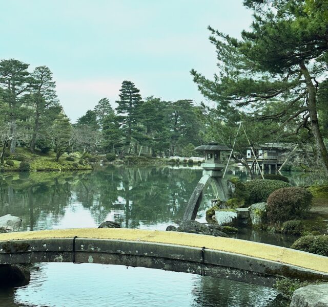 あいにくの曇天ですが、庭は目の覚めるような鮮やかな景色でした。兼六園といえば徽軫灯籠。たくさんの順番待ちの間をみてサッと撮影。たしかにこの眺めが水面に映る景色もふくめて、最も優雅でした。