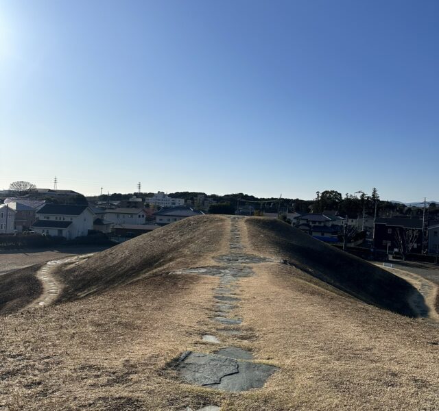 早朝だったからか贅沢に貸し切りです。日中であれば石室の中もみられるそうです。そして、なんと上に登ることができます。寒風吹きすさぶ中、古墳の上から古代人もみたであろう空と景色を眺めました。