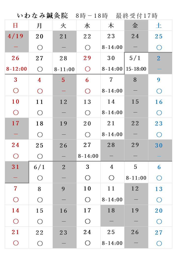 鍼療日・ニュース 2026.04.18 鍼療日 鍼療日のおしらせ 4/19-6/27 ご予約、お待ち申し上げます・専門学校講義のため基本は火金が休みです・時間限定日をご希望の場合や、空き時間の確認はお問い合わせからご連絡ください・初診の方、なるべく最終受付よりも早めの時間をご指定くださるようお願いします