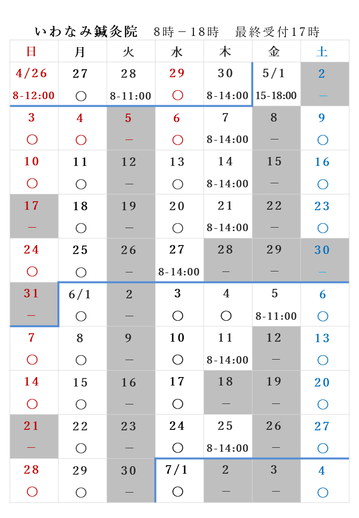 鍼療日・ニュース 2026.04.27 鍼療日 鍼療日のおしらせ 4/26-7/4 ご予約、お待ち申し上げます・連休は2(土)、5(火)を休診します・専門学校講義のため基本は火金が休みです・時間限定日をご希望の場合や、空き時間の確認はお問い合わせからご連絡ください・初診の方、なるべく最終受付よりも早めの時間をご指定くださるようお願いします